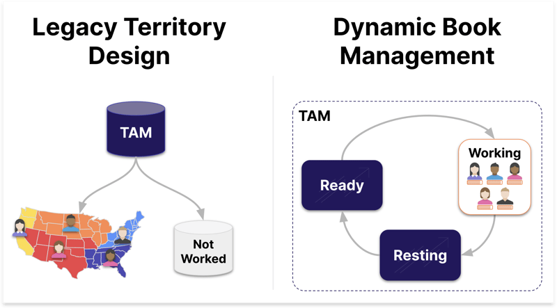 Dynamic book management is a modern territory design that continually matches available rep capacity with the best available accounts. It’s a flexible alternative to traditional sales territories that helps companies react more quickly to market changes and increase attainment.