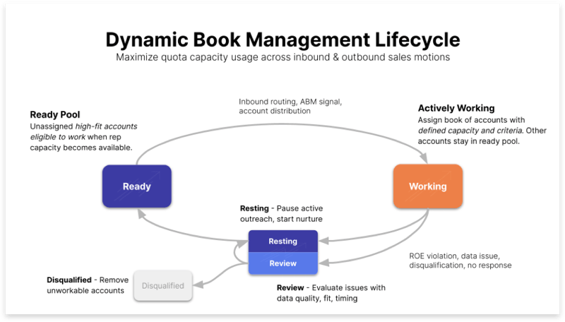 Dynamic book management relies on books instead of territories. A dynamic books approach is fungible and account based. A rep’s book is a collection of high-potential prospect accounts that match predefined criteria on ICP fit and intent timing. Accounts are moved into and out of a rep's book as they demonstrate intent and go cold, respectively.
